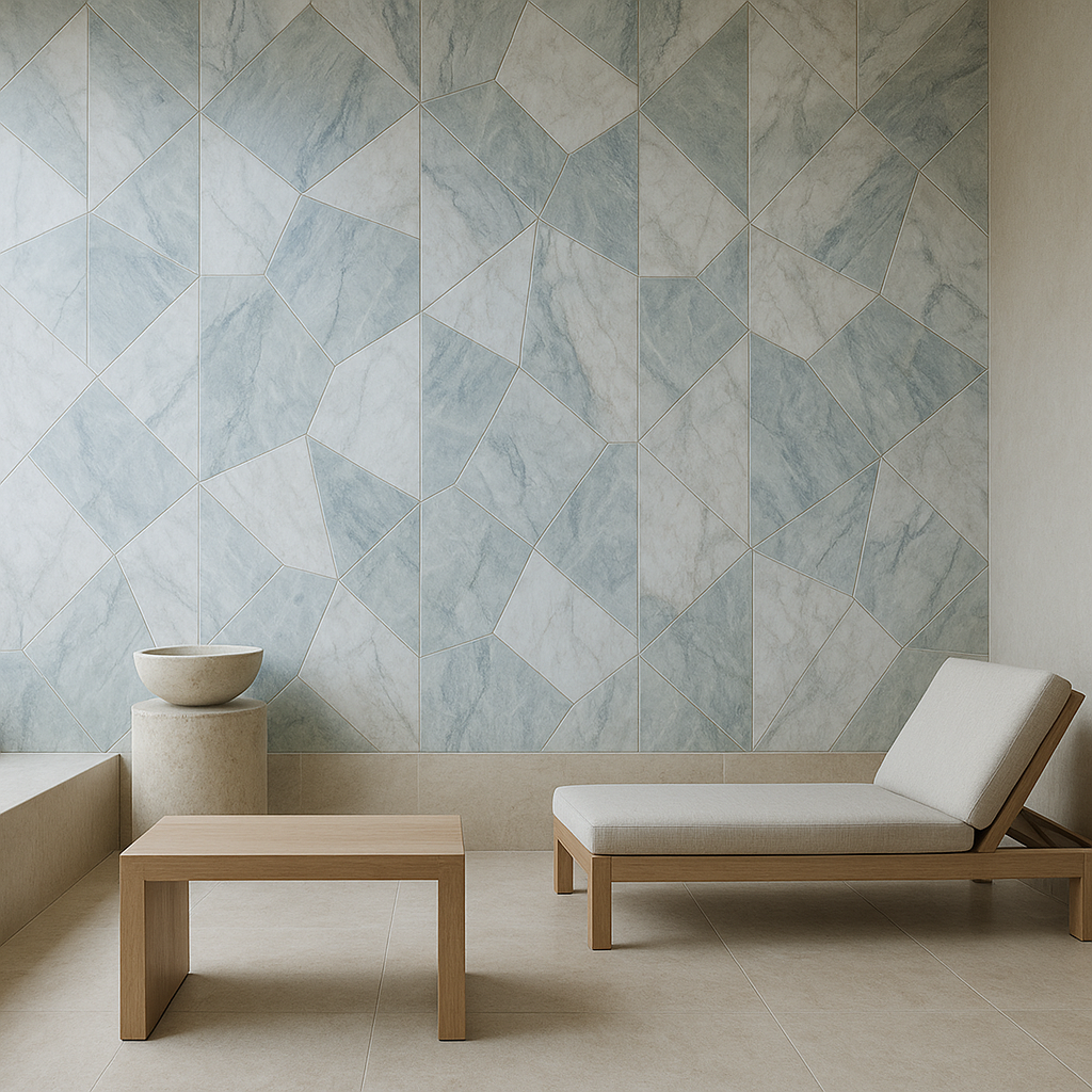 An artisan marble mosaic hand-assembled from reclaimed slabs, cut into geometric shards that evoke the fractured beauty of glaciers. Each piece is a unique work of craftsmanship, creating walls and floors of sculptural depth for spa sanctuaries and flagship interiors.